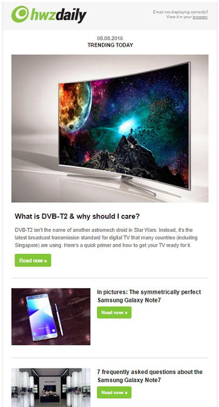 What if you had no time to follow all the updates on our site and you would like to have a content newsletter mailed to you for easy follow-up? For years now, our Infotech daily newsletter has served this purpose, but to keep up with the times, we've given it a thorough refresh and it's now rebranded into the HWZ Daily newsletter. The new format and layout now fetches the most read content of the day, so that you get to keep tabs only what matters to the masses. Here's a sample of how it looks and if you aren't subcribed yet, do it here now!