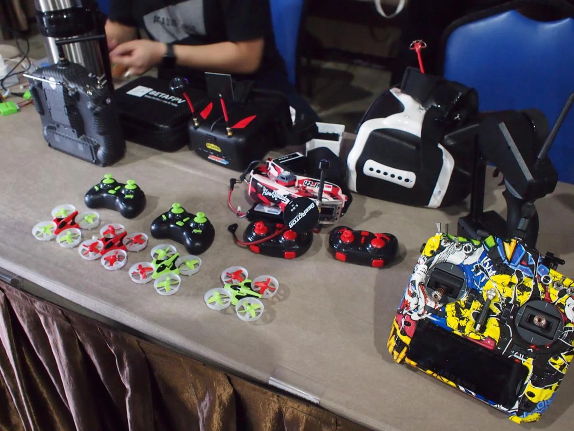 Located to the left after passing Hall 7’s entrance, the Drone Zone packs an array of controllers and palm-sized drones called Tiny Whoop, laid out on a row of tables. This is where registered competitors ready their machines, tuning and testing for a series of races held across three days.