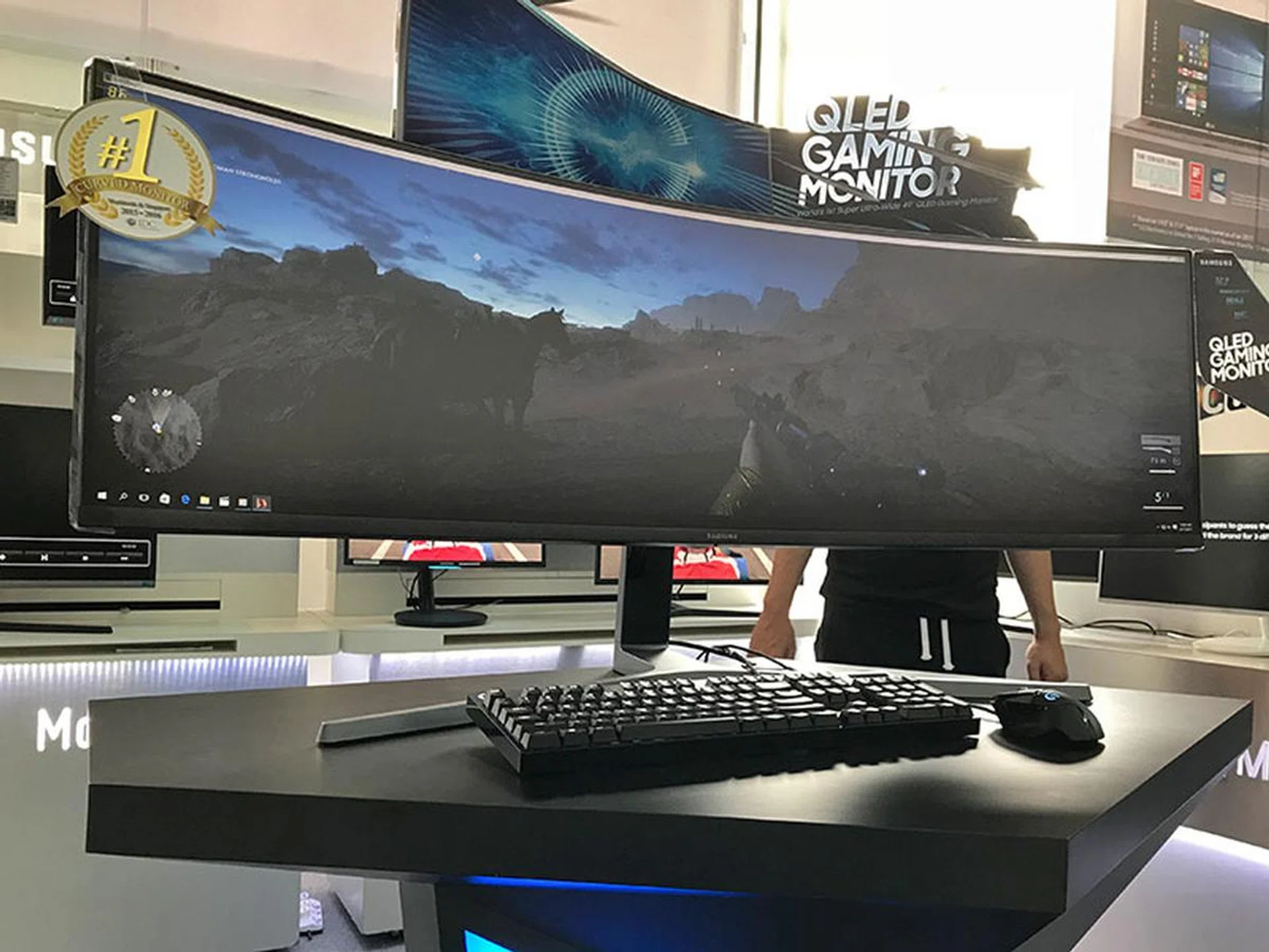 The Samsung C49HG90 is a giant 49-inch monitor with a 3,840 x 1,080-pixel resolution. It uses quantum dot technology for rich colors, has a refresh rate of 144Hz, and comes with a height-adjustable stand. Selling at CEF for $2,299 with free redemption of Creative Sound BlasterX Katana sound bar.