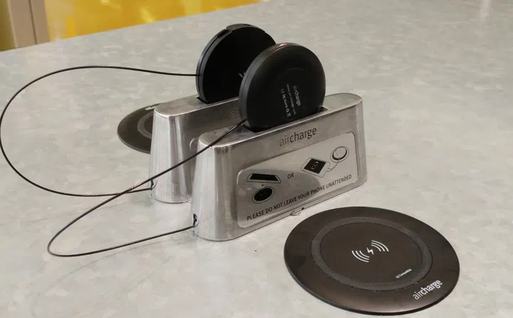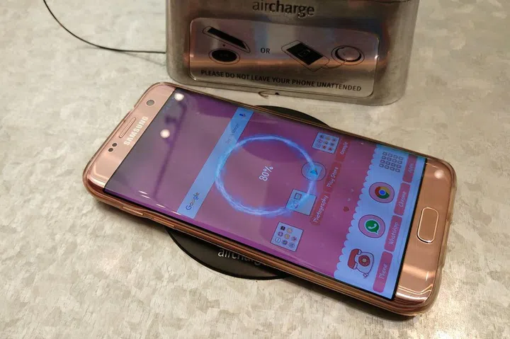 Aircharge is the provider of this solution and it’s essentially a wireless surface charger that conforms to the Qi wireless charging standard. So any device that supports this standard, like the Samsung Galaxy S7, can be charged wirelessly.