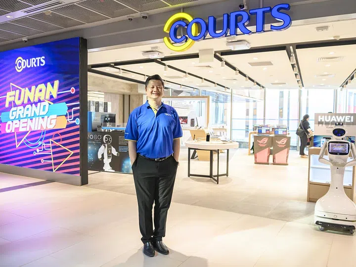 Country CEO of Courts Singapore, Ben Tan, stands in front of the new smart home-themed store at Funan Mall. The store marks the first time Courts has dedicated a retail outlet to IoT, smart devices, and the latest AI and voice-control tech, where around 80 per cent of its offerings are smart home-compatible.