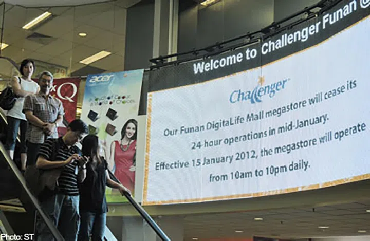 Do you know that Challenger at Funan used to operate 24 hours? It started in March 1, 2011. But the company went back to a 10am to 10pm opening hours starting January 15, 2012, citing low shopper volume.