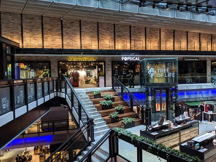 The entire place has a distinctly hipster vibe to it, with the soft lighting and brick walls. You can see here also the Tree of Life, a central structure that forms the centerpiece of the mall and boasts plug-and-play retail pods that can host pop-up stores.
