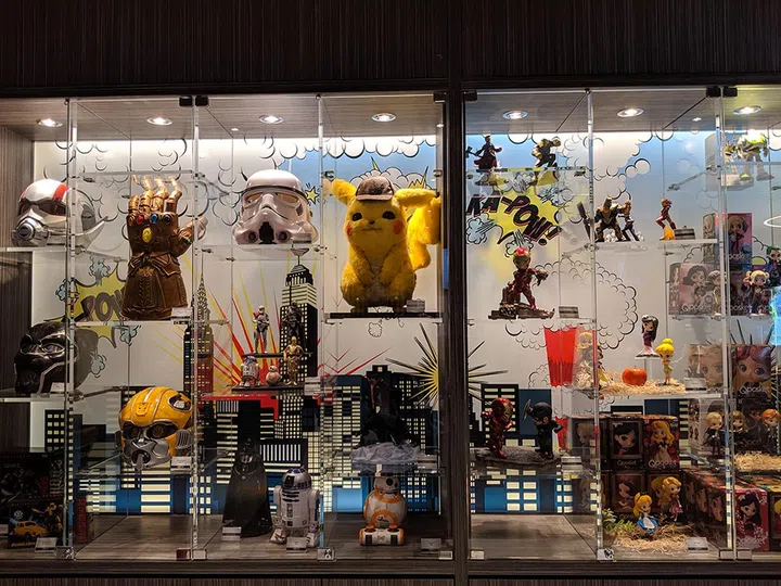 The cinema has a pretty nice selection of movie memorabilia, including Thanos' glove. Some of the items have prices listed, so it looks like you'll be able to buy them. Unfortunately, Detective Pikachu is not for sale.