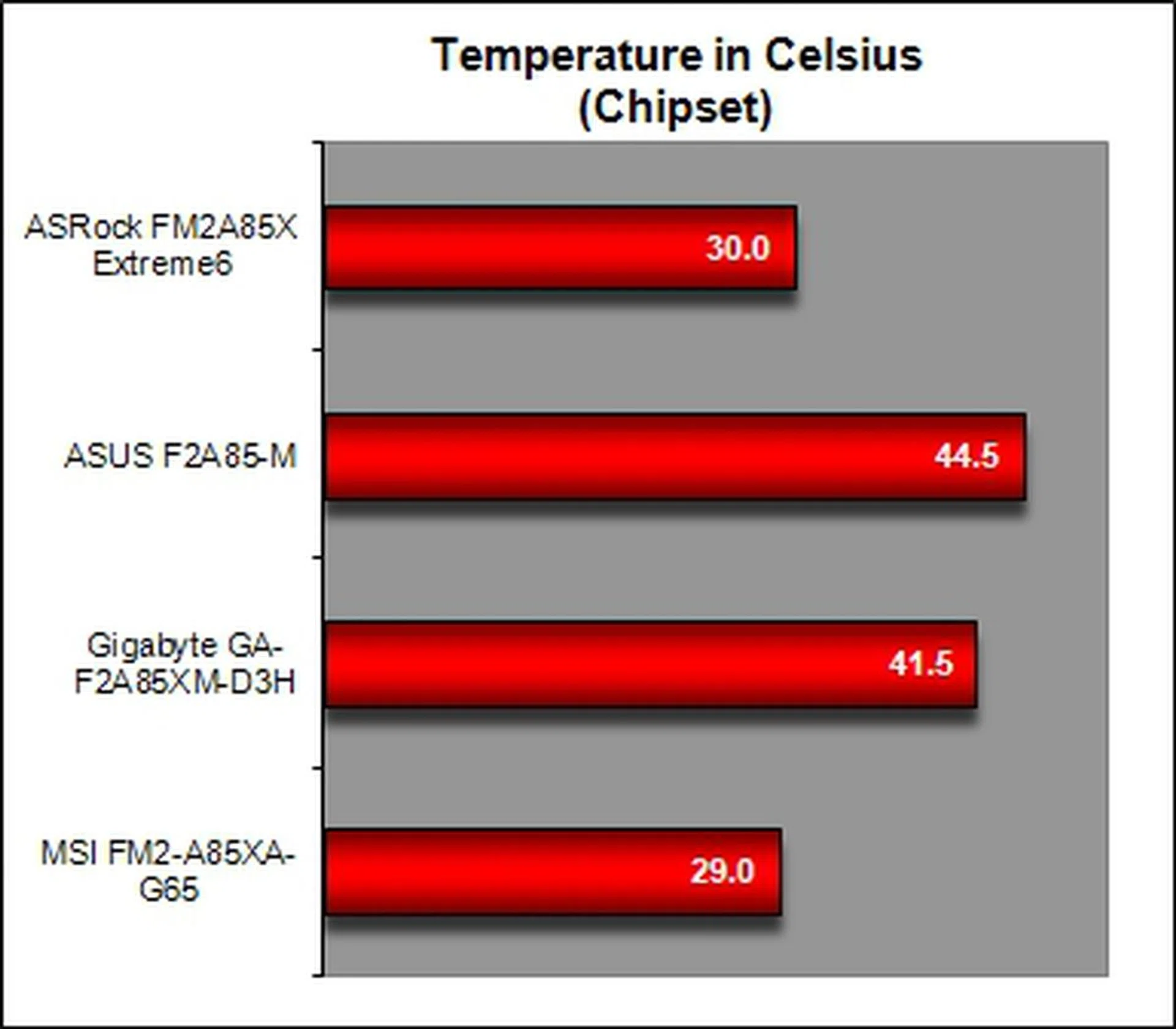In terms of general computing performance, the boards all had rather similar performance levels according to the SYSmark 2012 benchmark. As we up the ante to more taxing benchmarks, it was the ATX boards that came out slightly ahead. For gaming pursuits, the differences between the boards were small, but MSI edged ahead most of the time. Only ASRock was tagging along slightly below expectations. The outcome was also the same in our power draw test and chipset temperature checks, where the MSI FM2-A85XA-G65 took the pole position overall.