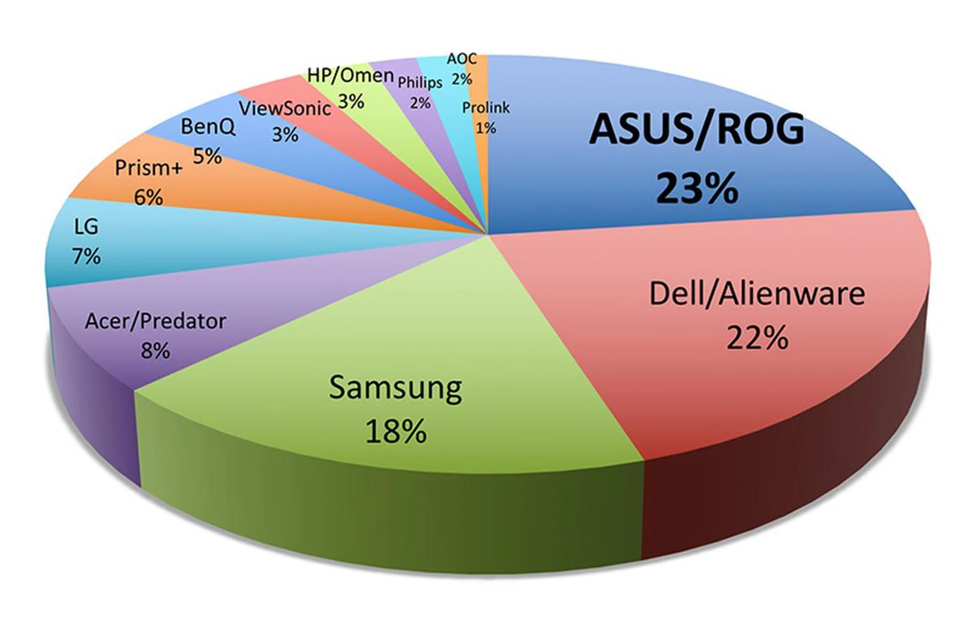 With 23% of the votes, ASUS is our readers’ favorite gaming monitor brand. Of the several monitors launched by ASUS in 2017, the ones that caught our eye include the ROG Swift PG258Q, a 24.5-inch, G-Sync-capable monitor that also touts a 240Hz refresh rate; and the ZenScreen MB16AC, a 15.6-inch portable monitor that uses USB-C. We also like the ROG Swift PG27VQ, which at long last is selling in Singapore this February. Sporting a 27-inch curved panel with a 2,560 x 1,440-pixel resolution, this G-Sync-capable gaming monitor also boasts a 165Hz refresh rate, a 1ms response time, and ASUS’ Aura Sync RGB illumination for more bling. Very close behind in second place is Dell (22%), which last year introduced the world’s first 32-inch 8K monitor. The Alienware 25, a 24.5-inch 1080p monitor with G-Sync and 240Hz refresh rate support, was also launched in 2017.
