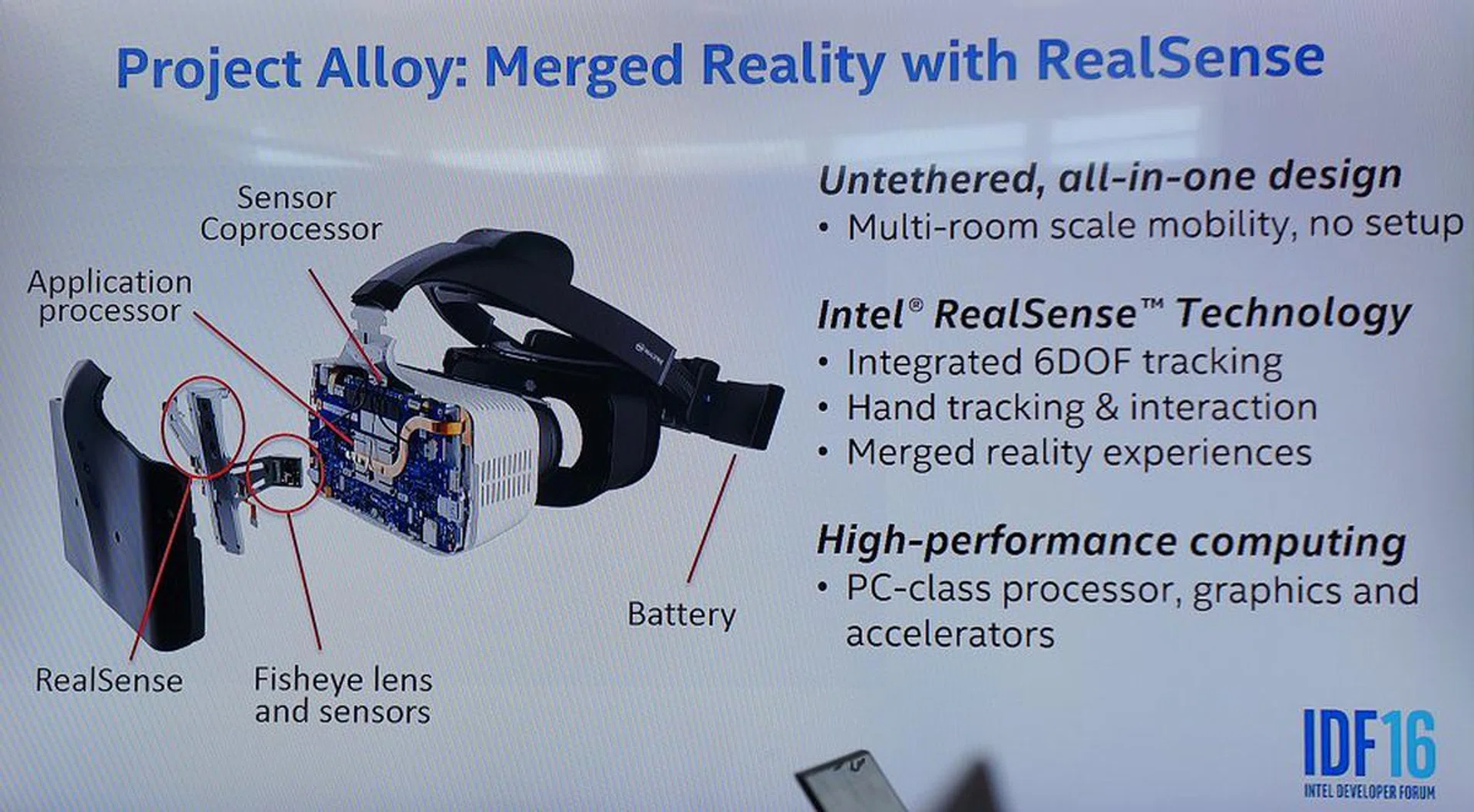 At Intel’s IDF 2016, one of the spotlights that holds a lot of promise is a next generation VR solution through Intel’s Project Alloy. In a nutshell, it’s an all-in-one VR headset that will offer a fully untethered VR experience with 6 degrees-of-freedom (6DOF) – without any other sensors or cameras. Heck, it doesn't even require a PC because it has an Intel Skylake processor onboard the headset to power whatever you need to run.