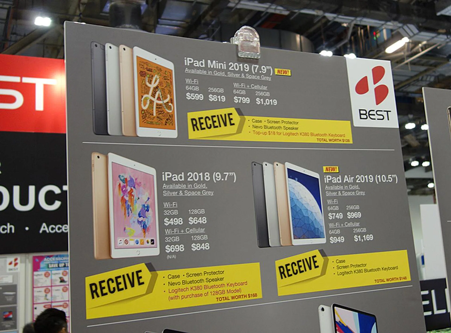There's also iPads on sale here. Pick up a 2019 iPad Mini (Wi-Fi + Cellular, 64GB) for $799, and get a free accessories bundle, worth $128, that comprises a case, screen protector, Nevo Bluetooth speaker. Top up $18 to get the Logitech K380 Bluetooth keyboard.
