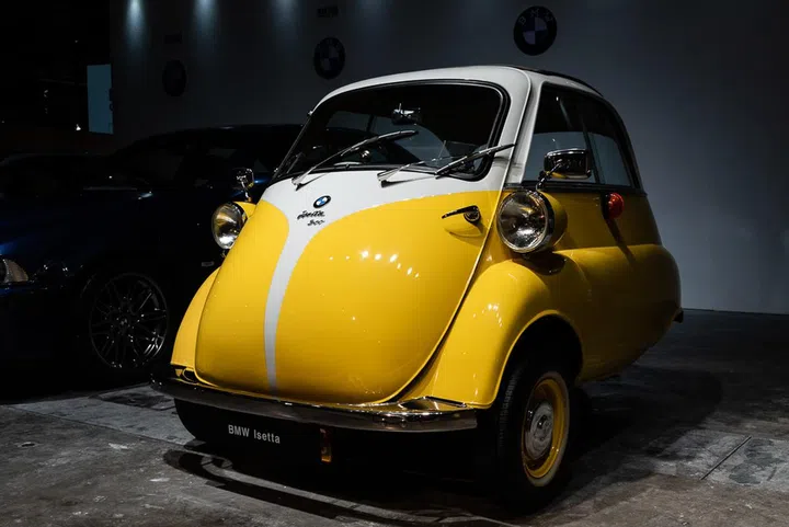 BMW’s heritage is also on show. This cute little BMW Isetta from 1955 has its door on the front, and has a 1-cylinder 250cc or 300cc BMW motorcycle engine!