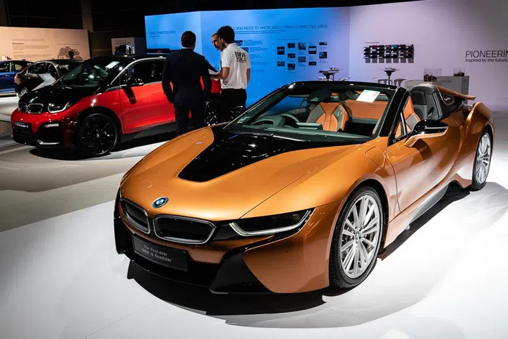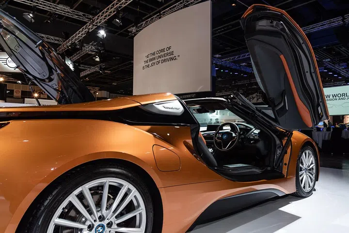 The i8 Roadster is powered by a 1.5 liter turbocharged three-cylinder engine, paired with an electric motor. And gullwing doors, yes.