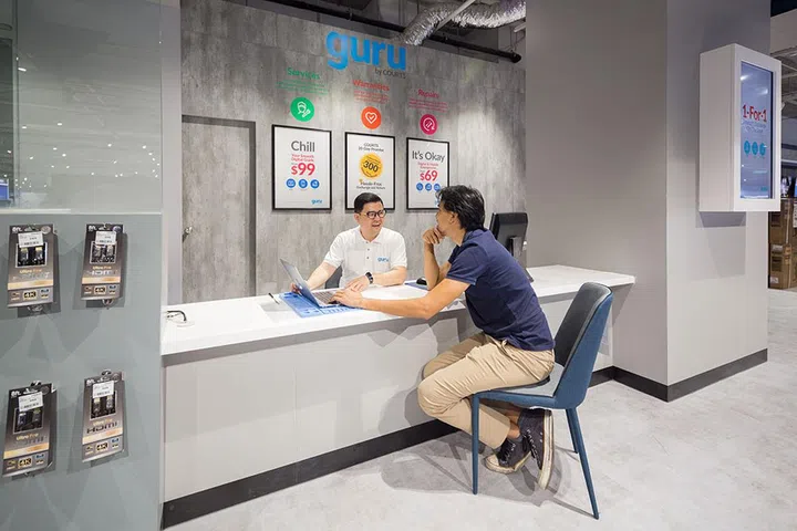 There's a counter just for GURU, a service offered by Courts that gives shoppers access to over 100 repair and maintenance services. It covers over 20 home product categories, including things like smart home configuration and mobile phone repairs. The best part is that you don't have to buy something from Courts to use GURU, and anyone can take advantage of it.