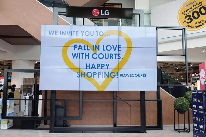 The first thing you see when you step into the main atrium is the three-by-three grid of 55-inch displays. It's topped by a sprawling 86-inch screen, and both displays will feature the latest updates from Courts and LG.