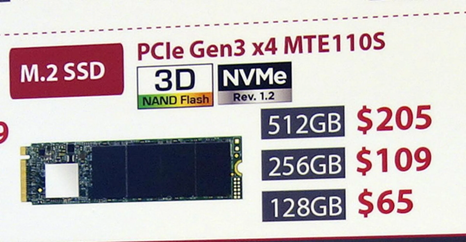 The Transcend MTE110S is a M.2 PCIe-based NVMe SSD that features 3D TLC NAND flash memory. It comes in three capacities, i.e., 128GB ($65), 256GB ($109) and 512GB ($205).