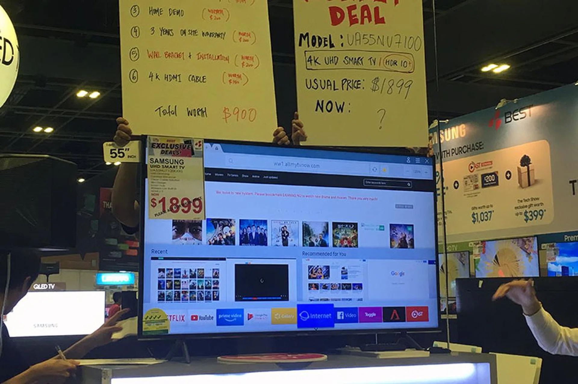 The NU7100 is an entry-level 4K smart TV from Samsung. Prices start at $967 for the 43-inch model all the way up to $5,279 for the 75-incher. When we were there earlier today, the 55-inch model was going for $1,500 during the hourly special, and came with many free gifts such as grocery vouchers and 3 months Singtel Cast subscription.