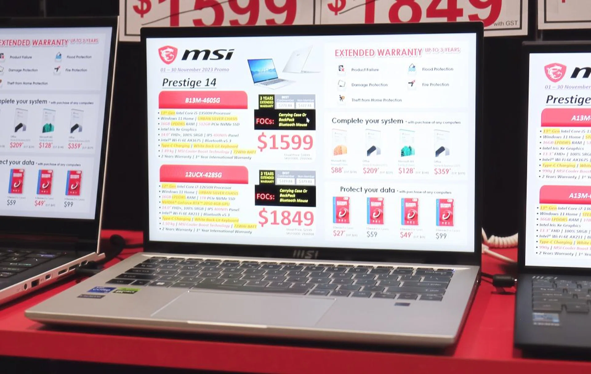 The MSI Prestige 14 is a 14-inch ultraportable notebook with an FHD IPS display, Intel Core i5-13500H processor, 16GB of memory, and 512GB SSD. It also has two USB-C Thunderbolt 4 ports and it supports Wi-Fi 6E. It's going for S$1,599 and comes with a free Bluetooth mouse and the choice of a free carrying case or backpack.