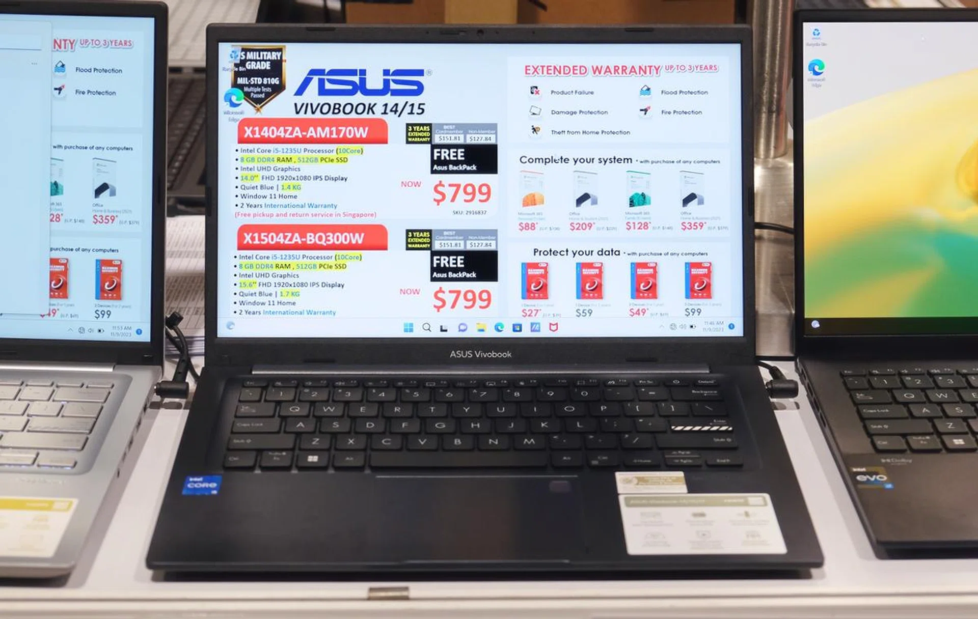 The ASUS Vivobook 14 is one of the more affordable 14-inch notebooks I saw. It comes with an Intel Core i5-1235U processor with 8GB of memory and a 512GB SSD. There's also a 15-inch version that comes with the same specs. Incredibly, both versions are priced identically at S$799 and will come with a free ASUS backpack.