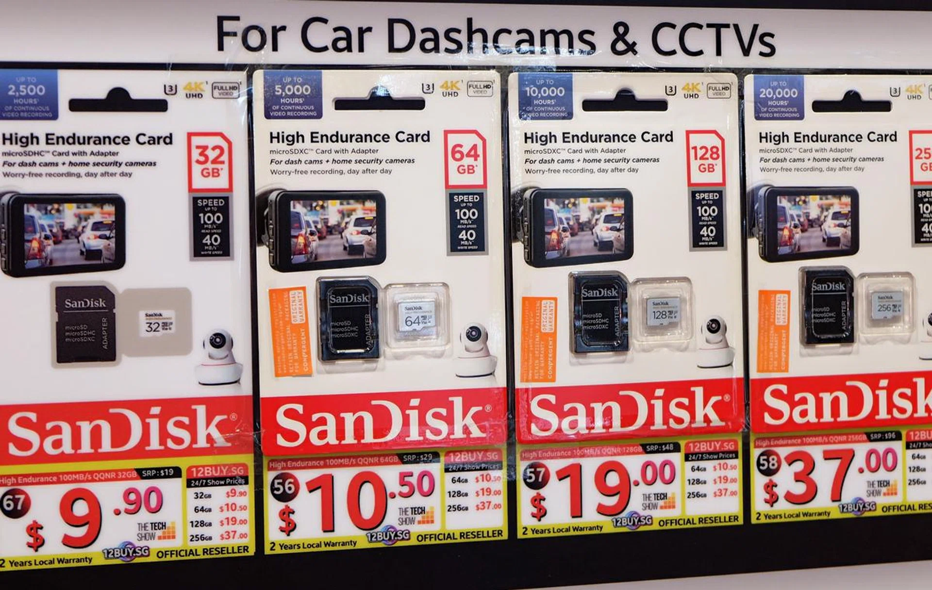 Looking for a microSD card to use with your car's dashcam? Check out SanDisk's High Endurance microSD cards. These cards are designed for use with dashcams and CCTVs, and can record up to 40,000 hours. Prices start from just S$9.90 for a 32GB card. A 256GB card is S$37.