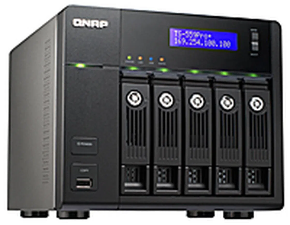 | The TS-559 Pro+ takes up to five 3.5-inch or 2.5-inch SATA drives, has an Intel Atom 1.8 GHz dual core CPU and 1 GB of memory, support for iSCSI, and is VMware and Citrix certified. If your business consists of users working on different platforms, do not worry. This network accessed storage (NAS) supports Windows, Mac, Linux, and UNIX. It is a real workhorse. | |