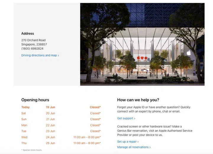 According to its website, Apple Orchard Store will reopen on 24 June with operating hours from 11am to 8pm. Apple Jewel Changi Airport will reopen on the same day with operating hours from 12pm to 8pm.