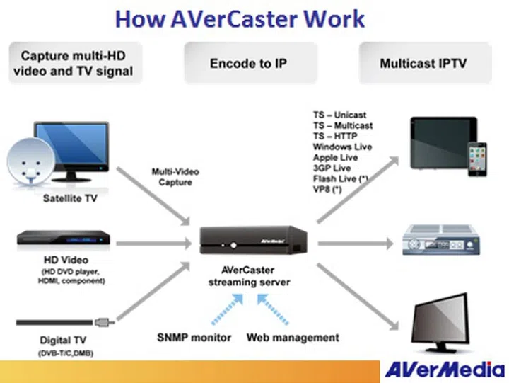 The AVerCaster is a reliable and organized relay station of live TV, video content and other value-added services. It supports various TV standards and video sources. Connected to Blu-ray players, cable or satellite TV set-top boxes, it transforms pay TV and other premium contents to IP signal and delivers multicast streams to clients within a LAN. IP set-top boxes are not required for watching the contents; the video streams can be delivered to any media player which supports TCP, UDP or RTP. Therefore, clients can enjoy the content offered by the service provider with Internet-capable devices including TV, PC, notebook, tablet and other handheld devices.