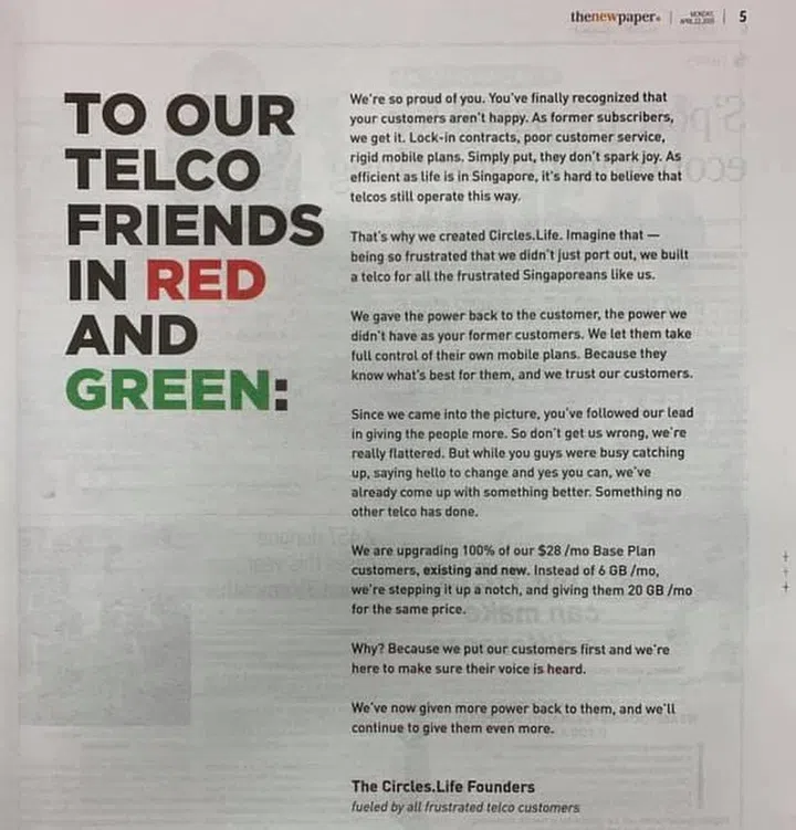 Continuing their untraditional marketing moves and messaging, Circles.Life replaced their S$20 for 20GB add-on rider offer for 'unlimted data', and even more recently, they've increased the data for their S$28 Base Plan from 6GB to 20GB/month for all existing and new subscribers. To drive this point across, they poked fun at Singtel and StarHub as seen in the above full-page founders letter they ran on Straits Times and The New Paper on 22nd April.