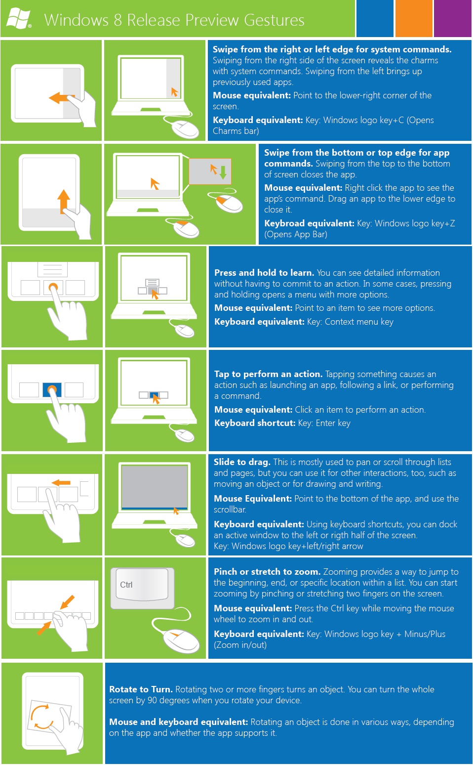 New ArticlesGuide to Windows 8 Release Preview GesturesHere's a quick guide to Windows 8 Release Preview gestures.By Joy Hou - 27 Sep 2012Earlier on, we've announced that Microsoft had released its Windows 8 Release Preview. Here's a guide to Windows 8 Release Preview gestures:-(Click for a bigger version) Our articles may contain affiliate links. If you buy through these links, we may earn a small commission.Tagsmicrosoftwindows 8Share this article
