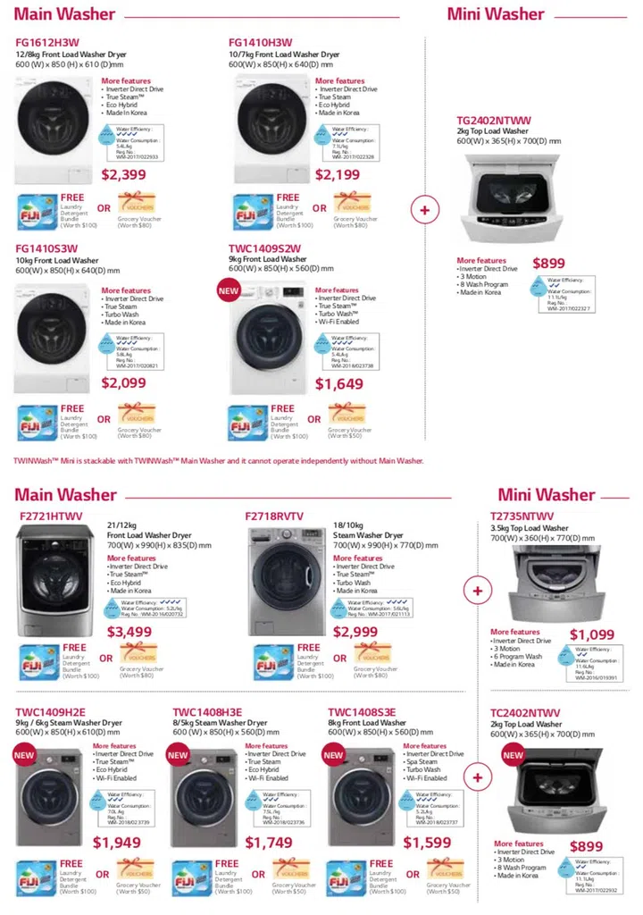 All three TwinWash mini washers come with LG’s inverter direct drive technology, 3 motion wash, two water efficiency ticks, and are made in Korea. The TG2402NTWW and TC2402NTWV have eight washing programs, while the T2735NTWV has six.