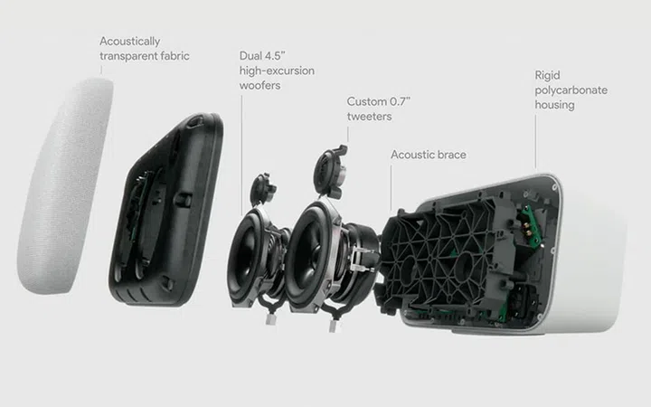 The Home Max features dual 4.5-inch woofers and custom 0.7” tweeters covered by fabric, with far-field microphones that are supposed to hear your queries even when the music is playing.