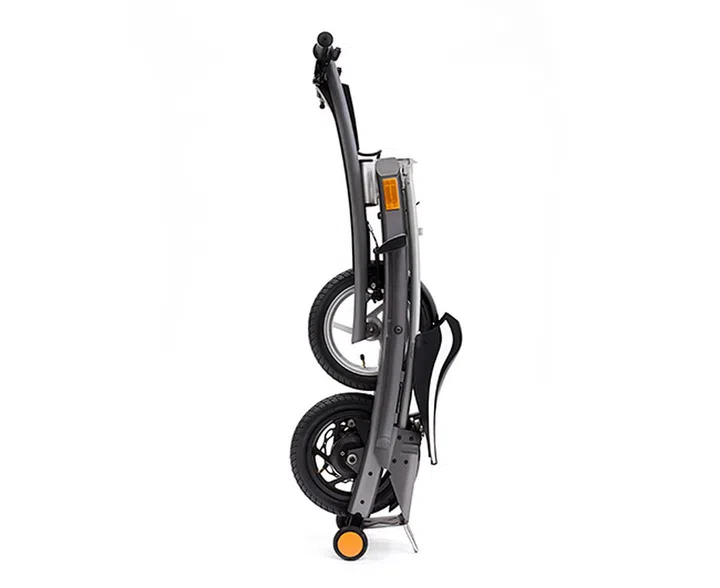 The Stigo is a seated electric scooter that goes up to 25km/h, and has a range of up to 25-40km per charge (depending on the power pack option you choose). The Stigo measures 1,050 x 480 x 805mm and weighs 14.1kg/15.3kg, you can fold it into itself then lug it around like a golf trolley bag.