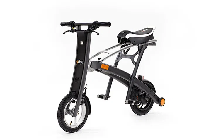 The Stigo is a seated electric scooter that goes up to 25km/h, and has a range of up to 25-40km per charge and folds into itself for easy lugging around.