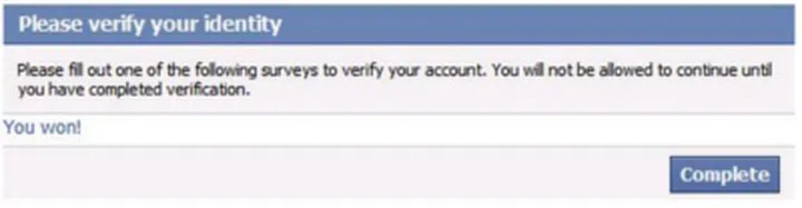 Next, the following message is displayed, which has the Facebook “look and feel” – as below. However, filling out the survey doesn’t verify anything. It just nets a survey fee for the spammers.