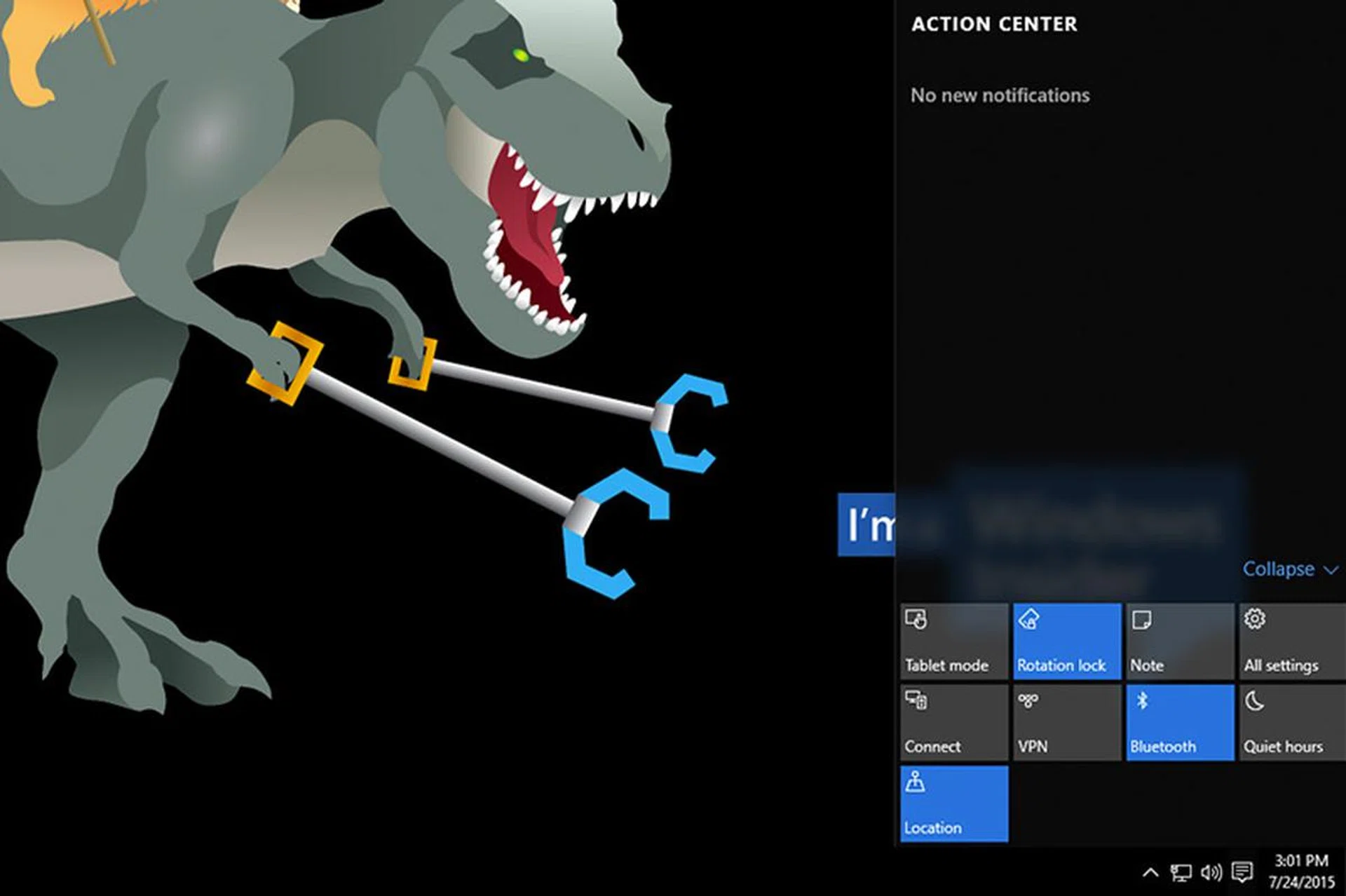 Windows Phone users will understand this better; but for those who don’t use Lumias, Action Center on Windows 10 is like Notification Center on OS X. A vertical pane on the right of the screen, it’s activated when you press a button in the notification area of the taskbar, or when you swipe in from the right side of the display.