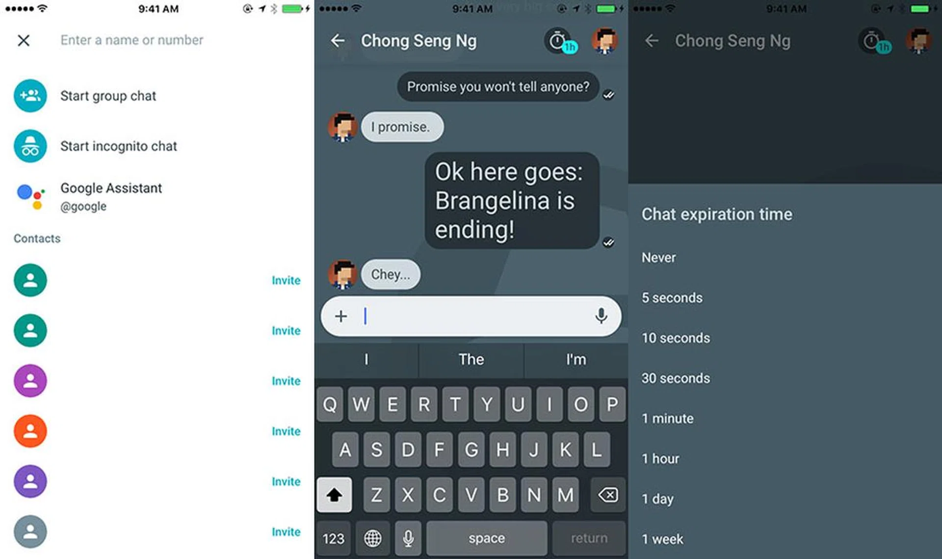 Regarding privacy, like Chrome, there’s an Incognito mode in Allo, which when enabled will encrypt your chats end to end, using Open Whisper Systems’ Signal Protocol. And in Incognito mode, lockscreen notifications and in-app chat previews won’t spill out chat contents. You’ll know you’re in Incognito mode when you see the hat-and-glasses icon overlaying the main chat icon and a dark gray UI when you’re in the chat. There’s a stopwatch icon you can tap too, which brings up a menu where you can set the chat expiration time (from 5 seconds to a week to never). Google Assistant won't work in this mode, since it has no chat logs to work on.