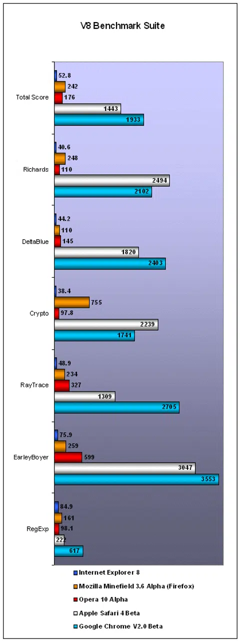 Google's V8 test is much more stressful on the browsers. While it's safe to say that Google's Chrome will perform well in this test, we were looking forward to see how the rest managed this. Take note that larger scores are better here. The result? None of the other browsers did as well as Chrome, though Safari came through with very good scores. Minefield and Opera didn't fare too well here followed by IE8 taking up the rear position again. While it may be argued that the V8 test is more suited for a browser with a V8 JavaScript Engine, do note that Safari 4 scored better on two tests compared to Chrome and actually managed pretty well on the rest of the individual tests too (in relative comparison to the other browsers).