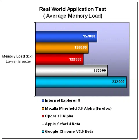 For another point of comparison, we'll be checking the memory load of each browser when all 20 tabs have finished loading to see which browser hogs up the most memory. From being the fastest browser, Chrome ends up as the worst browser in this comparison. This is because of the way the browser is designed with each tab treated as a separate process with its own memory allocation. Opera comes out as the lightest of the lot, followed by Minefield, IE8 and Safari. Of course, do note that as these browsers are still in alpha and beta stages, they may be lacking in features that could possibly end up using up more resources.