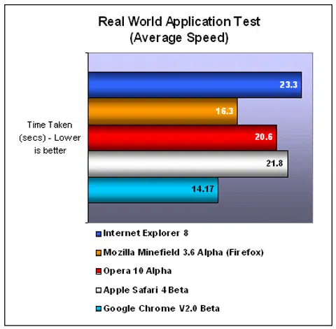 On to real world testing, we've loaded each browser with a set of 20 different web pages (a total of 20 tabs) to see how fast each browser takes to finish loading and rendering all of the requested websites. Understandably, we did worry about how latency would affect this test since it does play an important part for this test, but to our luck, our connection remained stable during the multiple runs for each browser to ensure that latency isn't a big factor. Not surprisingly, Chrome turns out to be the zippiest among the lot, with Minefield and Opera very close behind. Safari doesn't fare too badly either but again, you'll find IE8 right at the back of the lot. We do like to point out though that Safari 4 may be faster, but we experienced some odd freezes when loading the 20 pages that may have been a cause of its slower performance despite doing so well on the other tests.