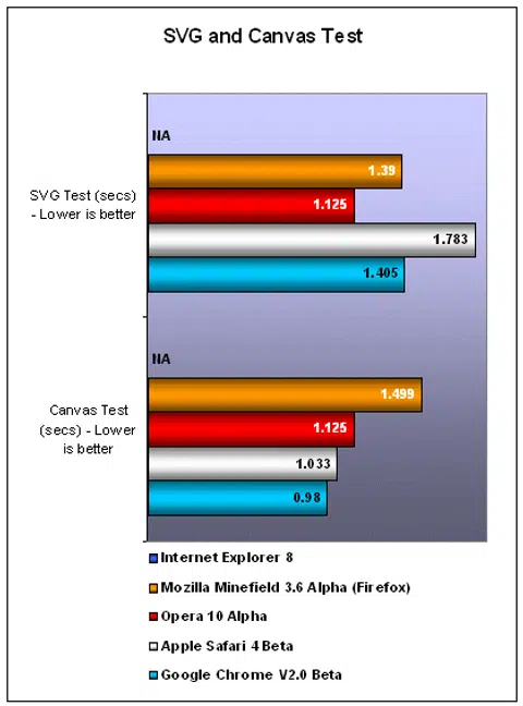 It's a really simple test that anyone can try, but it also helps to show how good the browsers are at handling Scalable Vector Graphics and the canvas element (in HTML5). This time around, we got a mixed bag of results, though do note that IE8 was unable to complete this test as it doesn't support SVG and canvas. Looking at the results, it seems like Opera 10 is probably the overall best for both SVG and canvas. Minefield on the other hand, while having the similar results for both tests, was much slower compared to Opera.