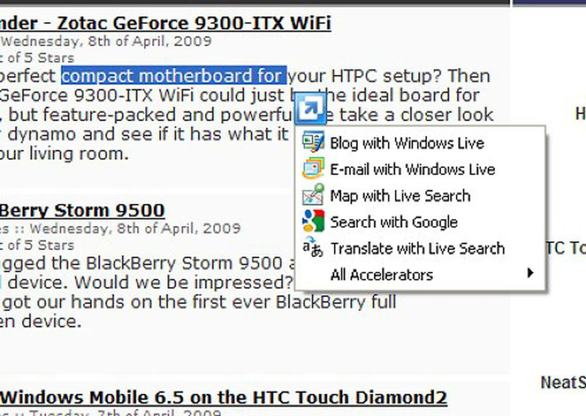 Accelerators - Accelerators offer users of IE8 to quickly jump where they need to go. Highlight a text and a button pops up. Click on it, and you'll be able to quickly access services to search the line of text, whether be it an address (to a map) or just a phrase (to run through a search engine). Just some convenience features to shave off those seconds.