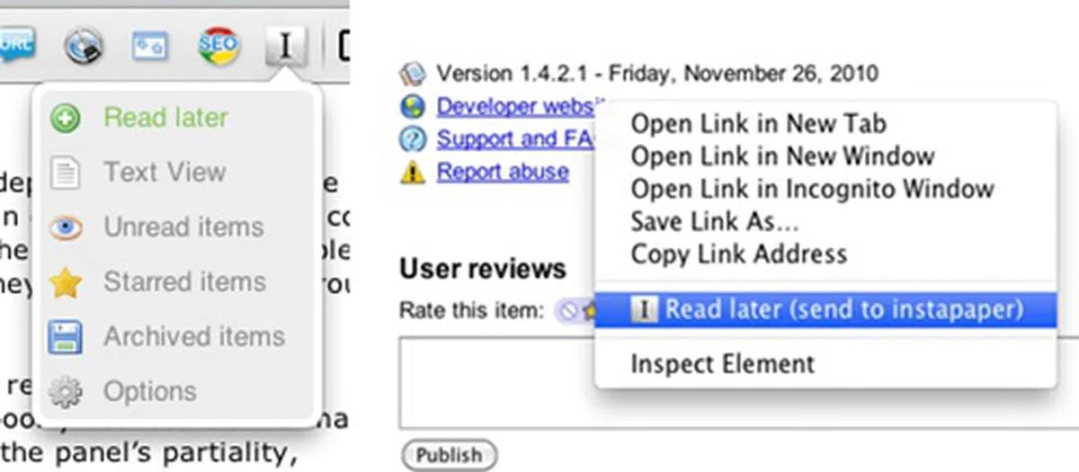 The Instachrome extension is extremely useful if you already have an existing Instapaper account. Well, if you do not have one, do get down to signing up for one - this free online service is especially useful in this day and age where there's so much information online and you don't have the time to read all of them. The useful web-based "service" allows users to collect online articles for later reading, and this is where Instachrome comes in handy. The extension not only provides a simple button that allows for one-click saves, but also,quick access to unread, starred and archived items that you have previously saved on your account.  | |