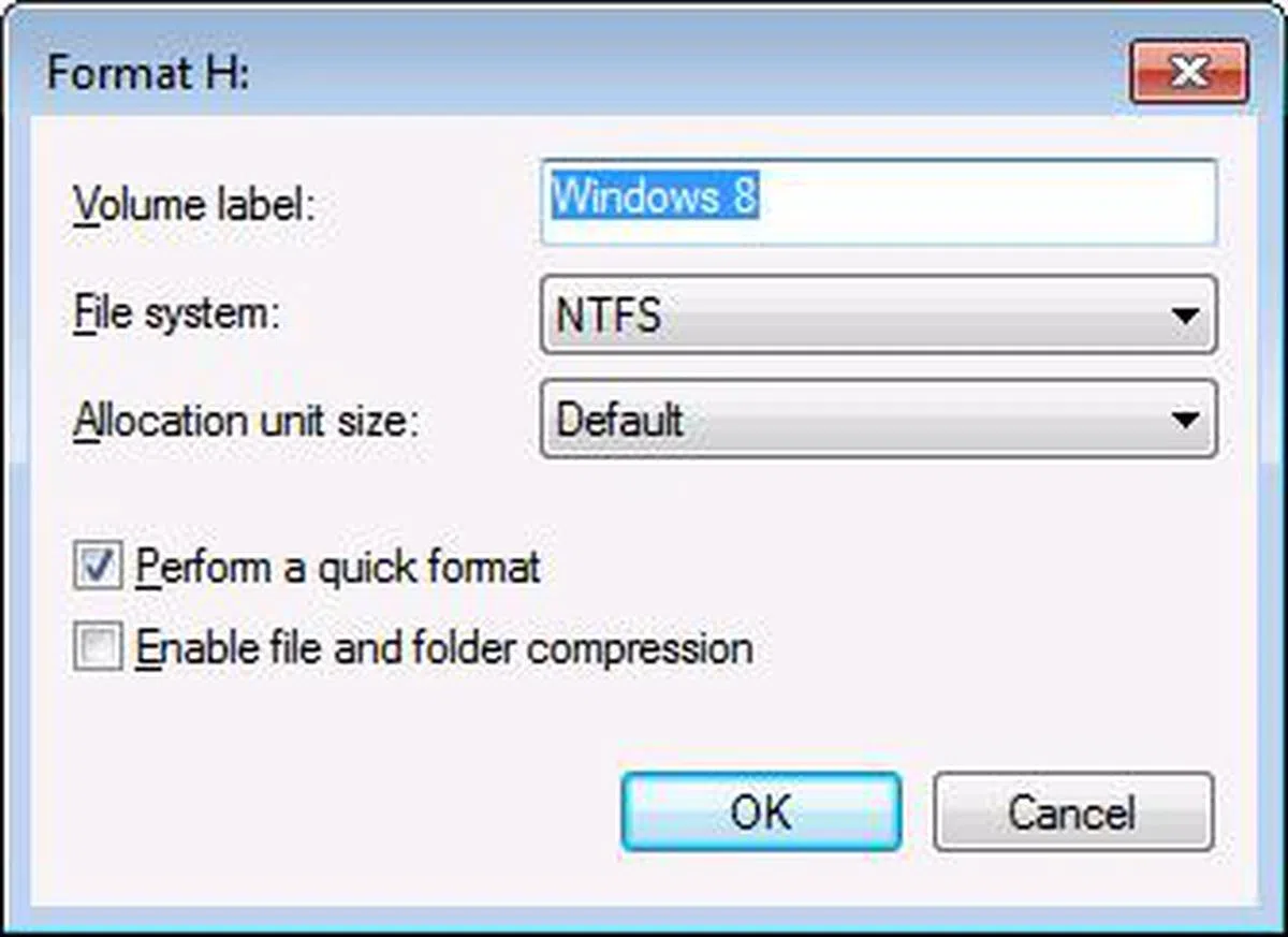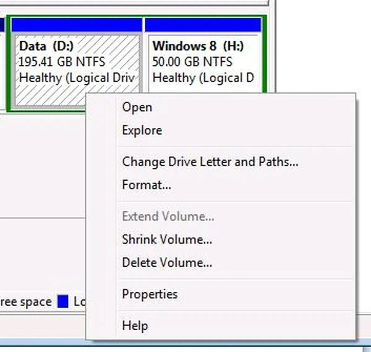 After the existing logical drive was shrunk, we right-clicked on the unallocated space and chose the "Format…" option. We typed a meaningful volume label (Windows 8) and left everything else to default values before we clicked the "OK" button.