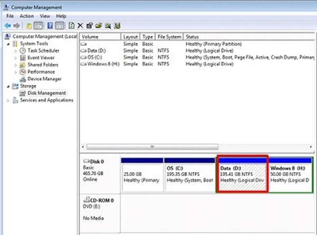 The first step was to ascertain if we had sufficient hard disk space as the recommended allocated disk space for a clean installation of Windows 8 Developer Preview was 20GB. We fired up Windows Management Console and picked the logical drive which has the largest amount of free disk space.