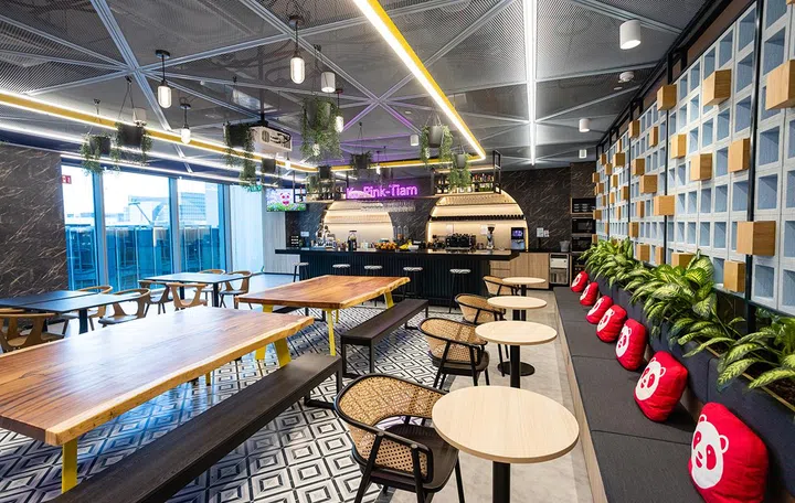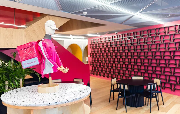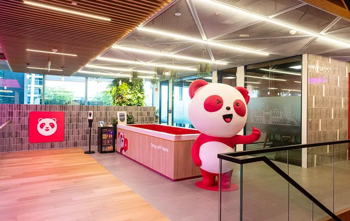 A floor below its main pantry area is a Foodpanda mannequin with standard delivery attire and more meeting areas.