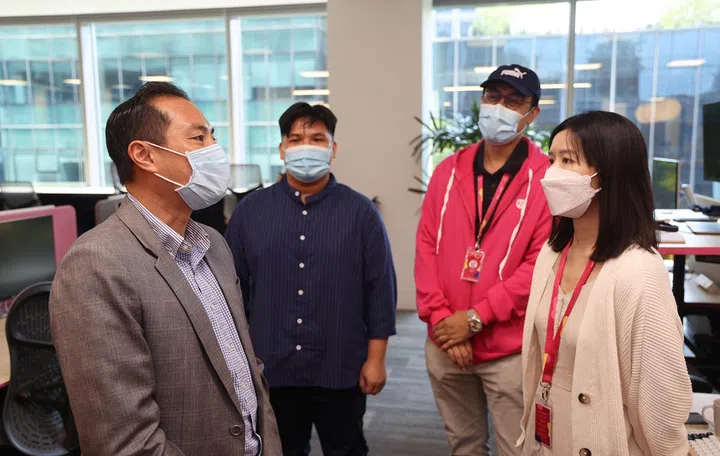 Pictured here is the CEO and VP (People and Corporate Tech) of Foodpanda giving SMS Tan Kiat How an office tour to demonstrate the property's sustainability efforts.