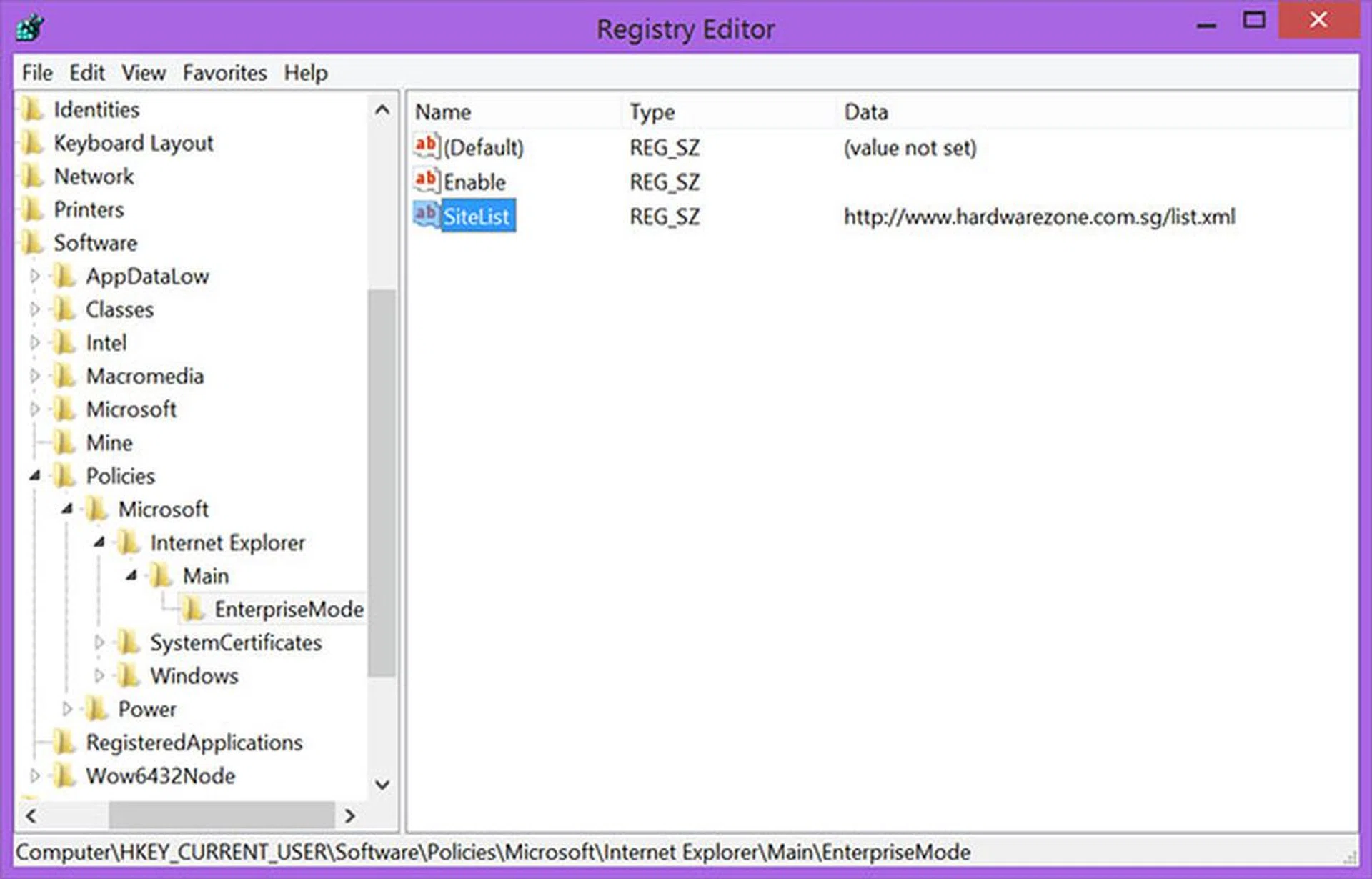 4. For IT pros, you might want to create a SiteList string value, and point to the list of websites you want to automatically open using Enterprise Mode. Of course, an easier way is to use the Enterprise Mode Site List Manager tool listed above.