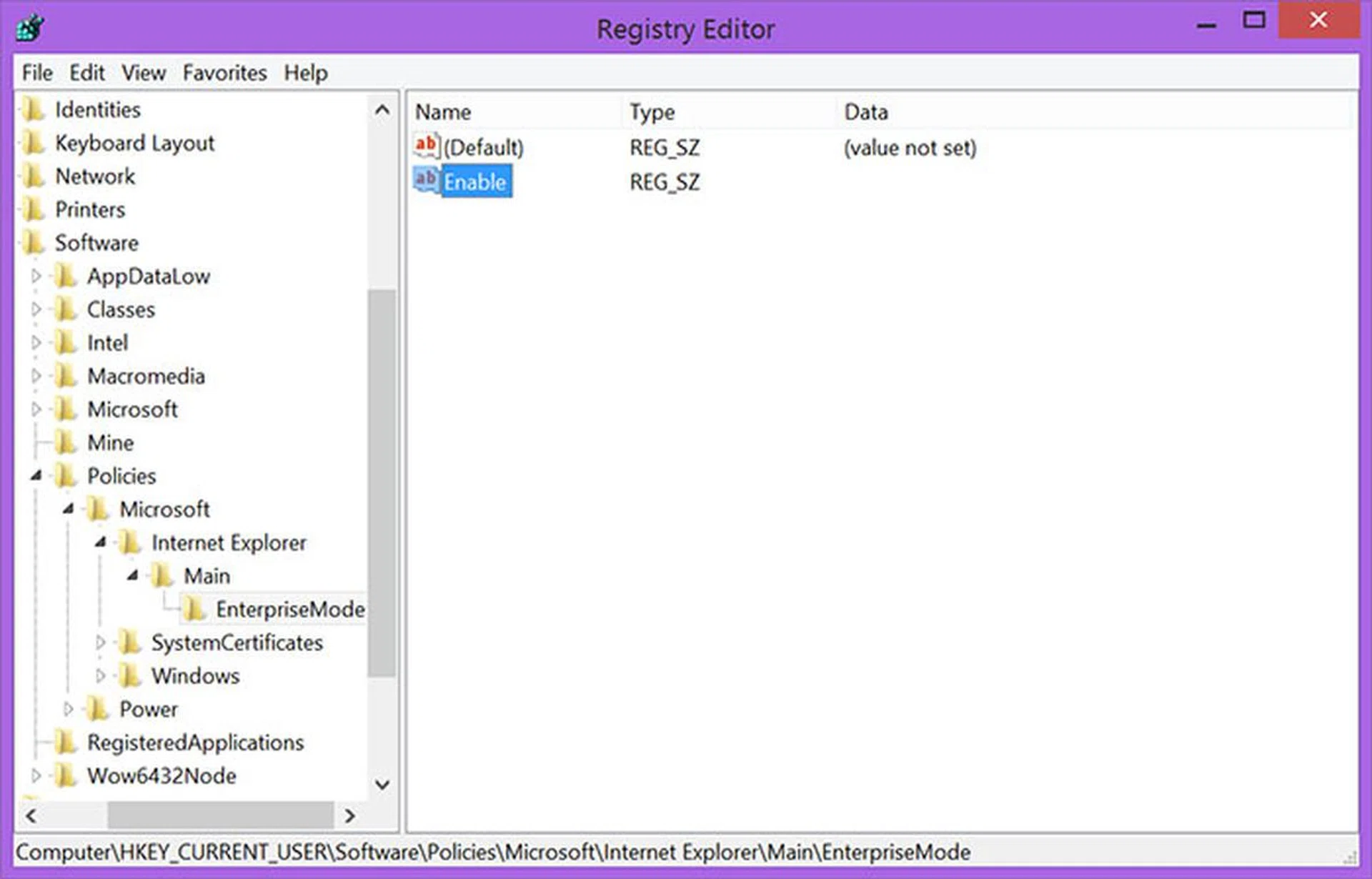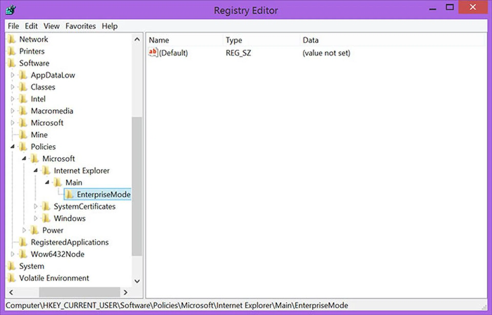 2. Navigate to: HKEY_CURRENT_USER\Software\Policies\Microsoft\Internet Explorer\Main\EnterpriseMode. If this key doesn't exist, create it.