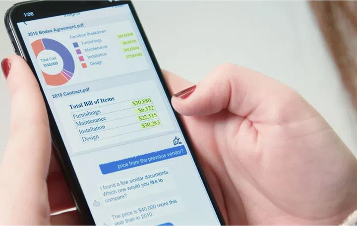 In the scenario offered by Adobe, all you need to do with a new contract is to ask ““How much does this cost?”. The Intelligent Agent uses NLP (natural language processing) to translate your voice and turn your question into a semantic query to search the document. You can then ask something more complicated like “How does this pricing compare with the previous contract I had with this company?”.