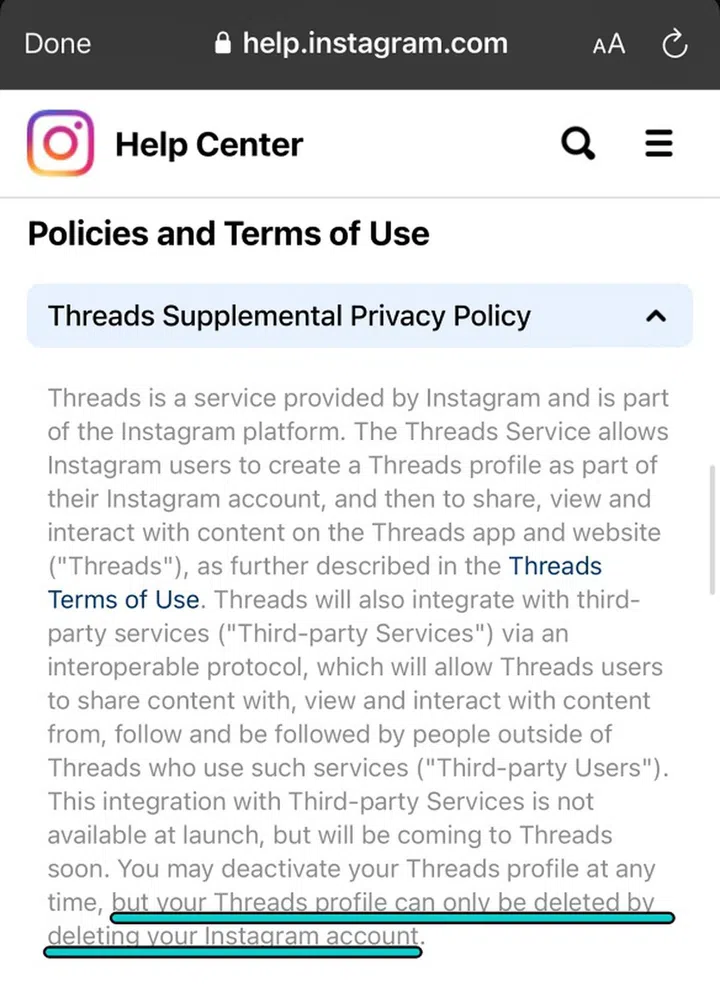 In the first paragraph of the Threads Supplemental Privacy Policy, Meta states that "your Threads profile can only be deleted by deleting your Instagram account". This is a sly yet effective growth hack for Threads as it is unlikely anyone will give up his/her Instagram account just to deactivate the Threads profile.