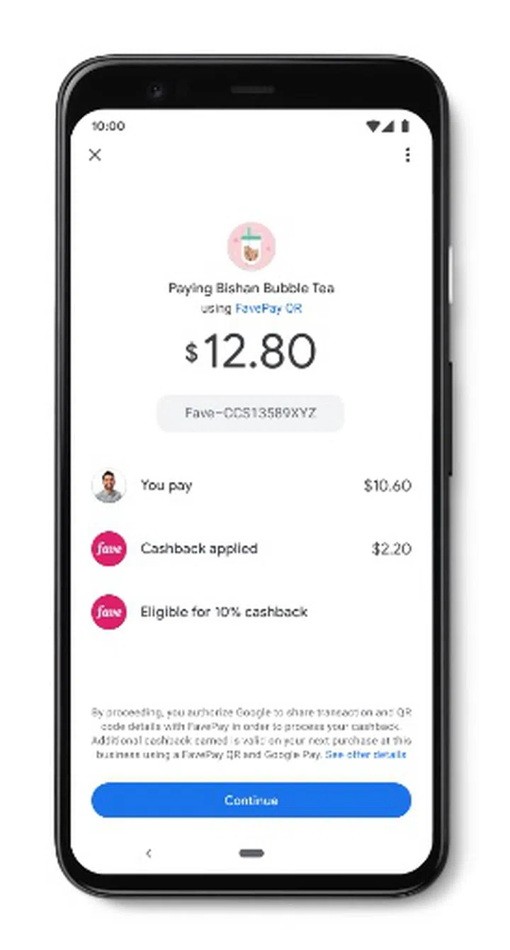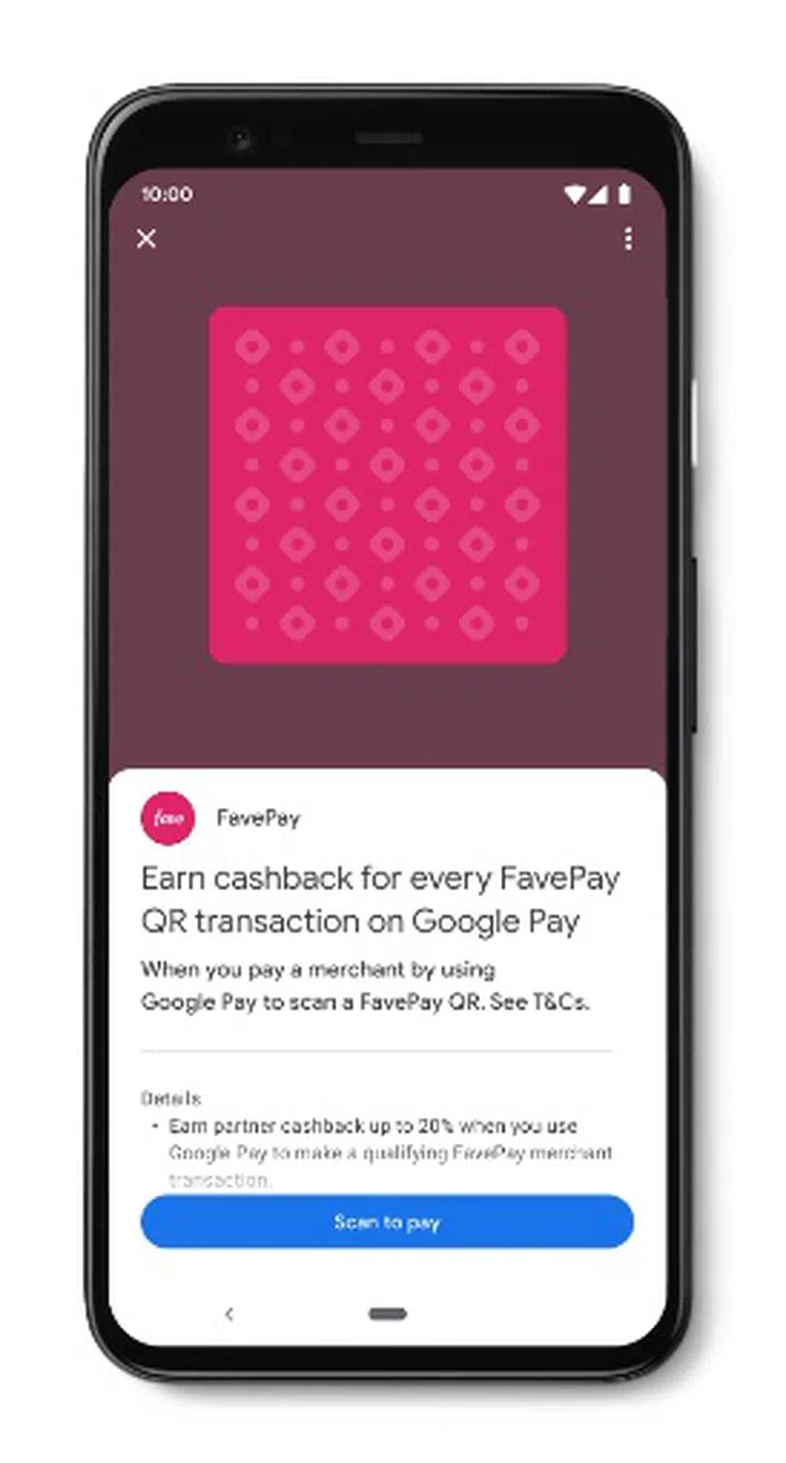 Google Pay users can earn up to 20% cashback paying FavePay merchants. Image source: Google.