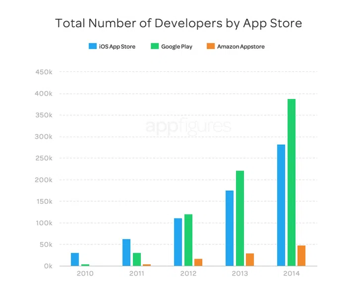 There was also a significant growth in the number of developers creating apps on Google Play in 2014, exceeding Apple for the third year in a row. According to the report, there are nearly 400k developers offering apps on the Play Store, compared to 300k on Apple App Store, and nearly 50k on Amazon's.