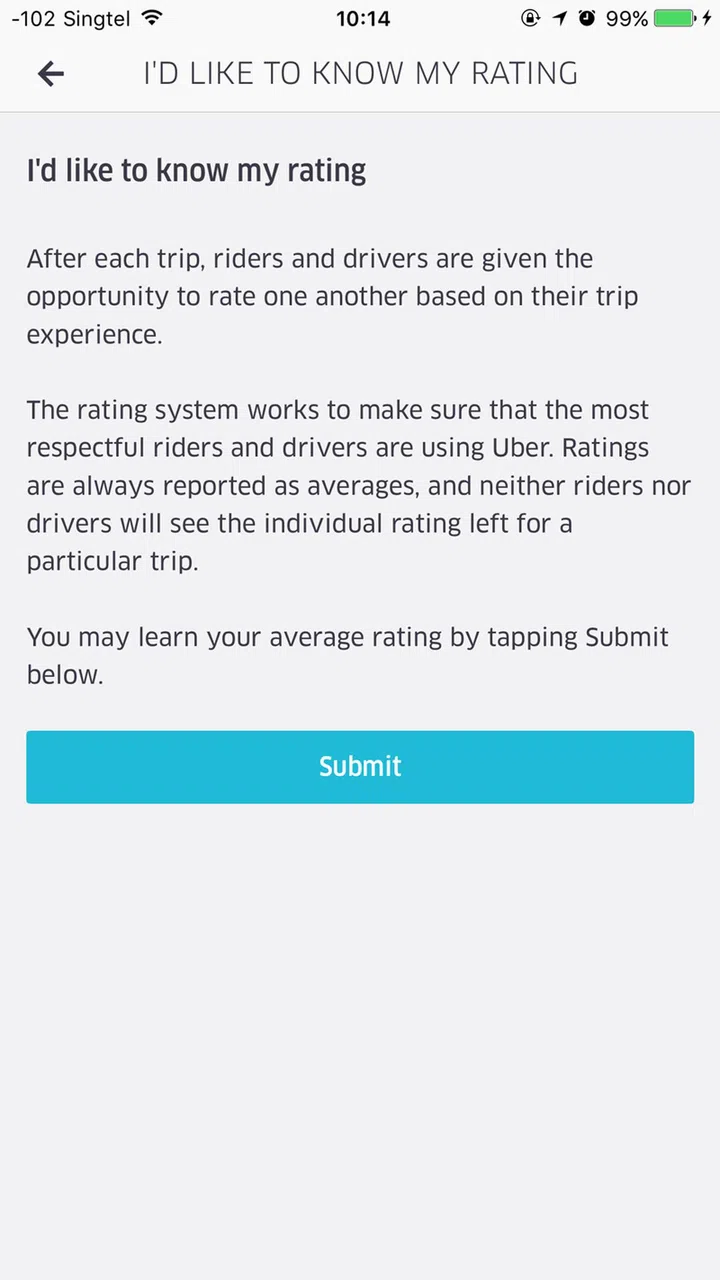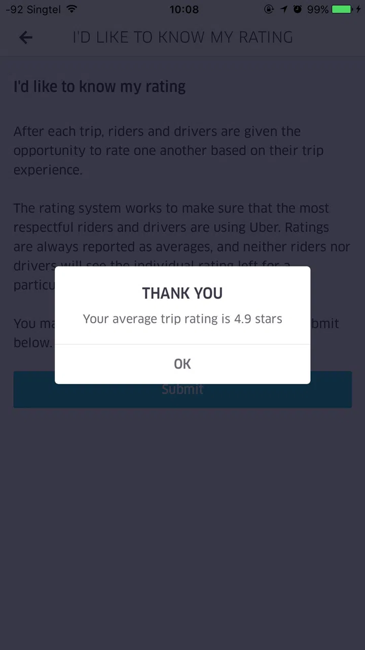 While the rating has no immediate consequence from Uber, drivers can actually pick and choose passengers based on a passenger’s score. An unofficial Uber driver forum thread from the US showed that reasonable drivers tend to think twice before picking any passenger below four stars. Most passengers tend to fall within 4.5 stars or higher. By comparison, expectations for Uber drivers are much higher. According to Uber’s FAQ across various cities, they are required to maintain a minimum of 4.4 to 4.5 stars to access the Uber app.
